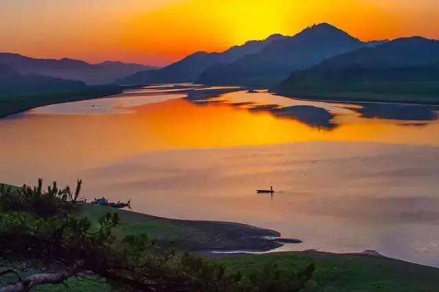 傍晚时分,林木茂密,水天一色,翠峰鹄立,湖中白帆点点,波光粼粼,一片宁静淡泊的世外桃源景象。