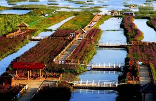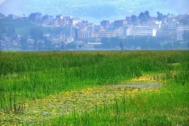 湖中的水草在碧水中开出一朵朵、一串串、一片片的黄花、红花和白花,船行其中,花随水波浮动,如入仙境。
