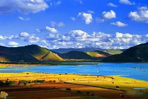 它镶嵌在雪山草地间,银波粼粼,蓝天白云、雪山映入湖中,如诗如画。