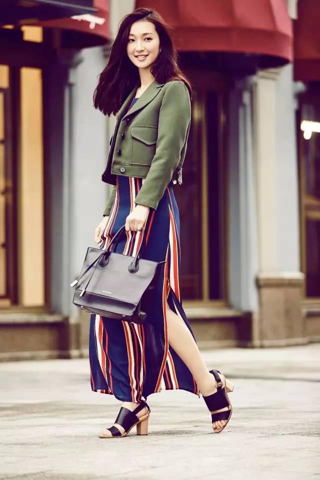 红白蓝条纹雪纺长裙,简单又不失女性的优雅大气,军绿色短款小西装外套给初春增一份暖,黑色简单包包,提升气场。