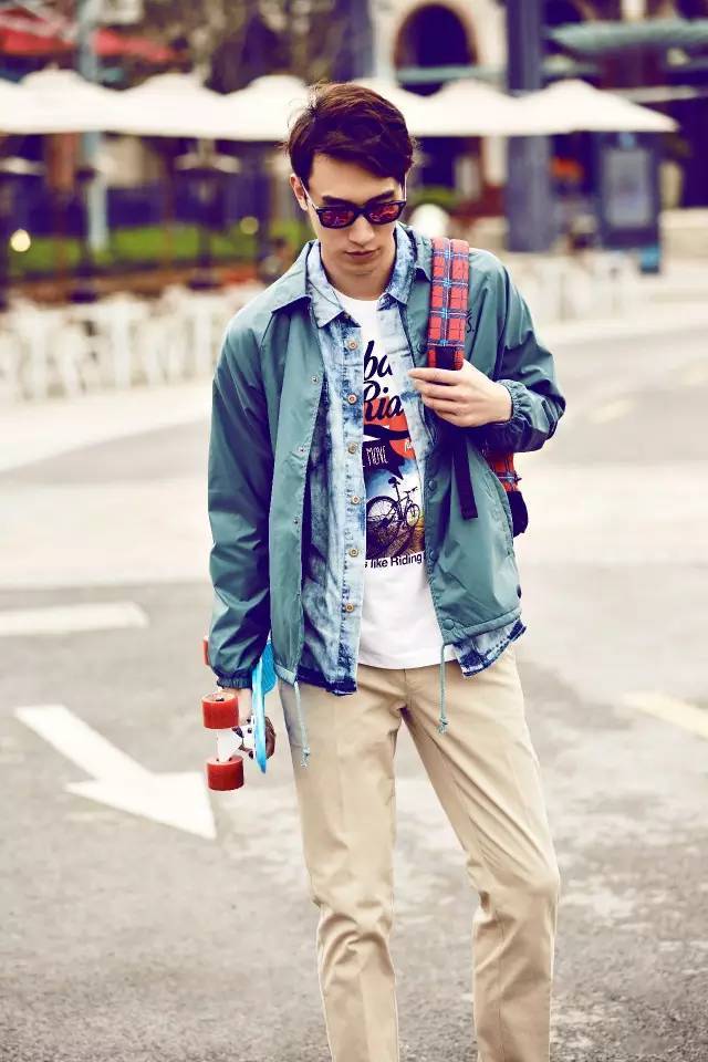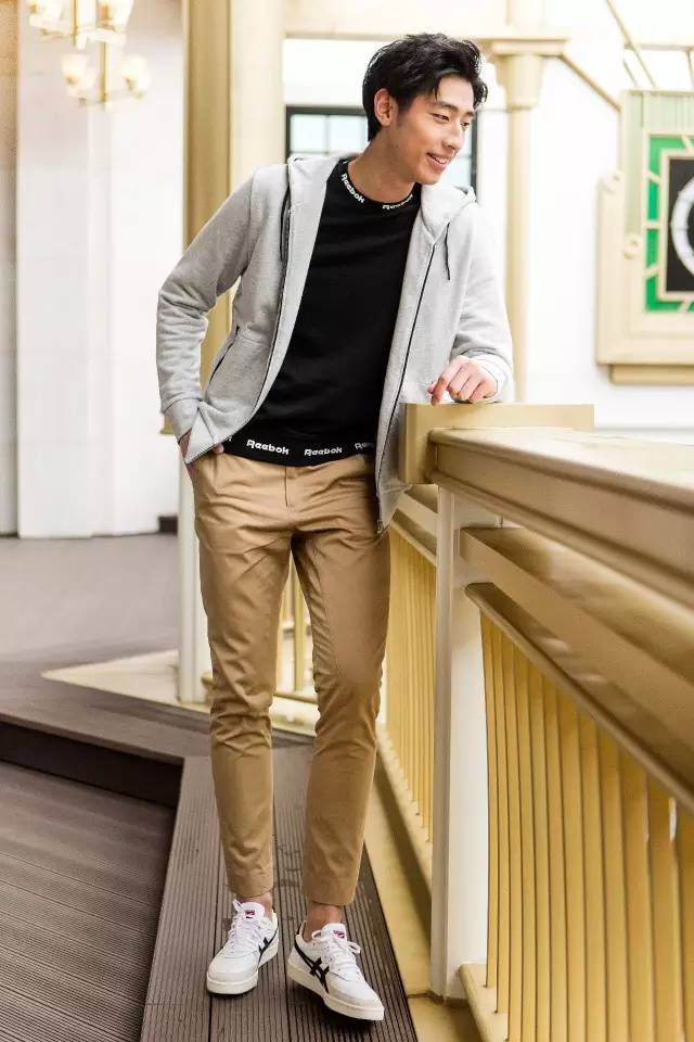 充满运动风格的连帽卫衣搭配舒适的卡其裤,并不追求造型有多么与众不同,但却默默的传达出舒适悠闲的氛围。