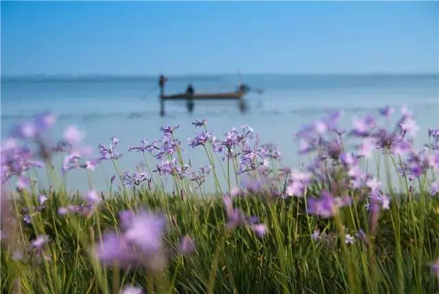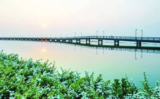 一泓湖水,一条长堤,环绕起一弯美丽的半岛。碧水蓝天,映着清风明月;红花绿树,满眼旖旎风光。不知名的小花开的正是俏丽,映的河面唯美浪漫。