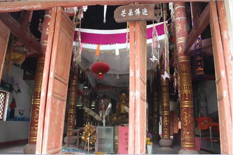 芒岛佛寺位于永平镇茂密办事处芒岛寨南,建于清光绪二十五年(公元1899年)。全寺占地3960平方米,前为山门,门内为大殿,殿东侧为僧房,大殿为三据歇山顶式围栏建筑,面阔3间,20米,进深5间15米,圆柱、门宙、藻井上均有花卉鸟兽人物木雕及贴印金色图案,殿门上悬“西天古圣”匾额,门左右悬挂极联:西天如来慈悲普渡;东鲁圣人教育汪洋。
