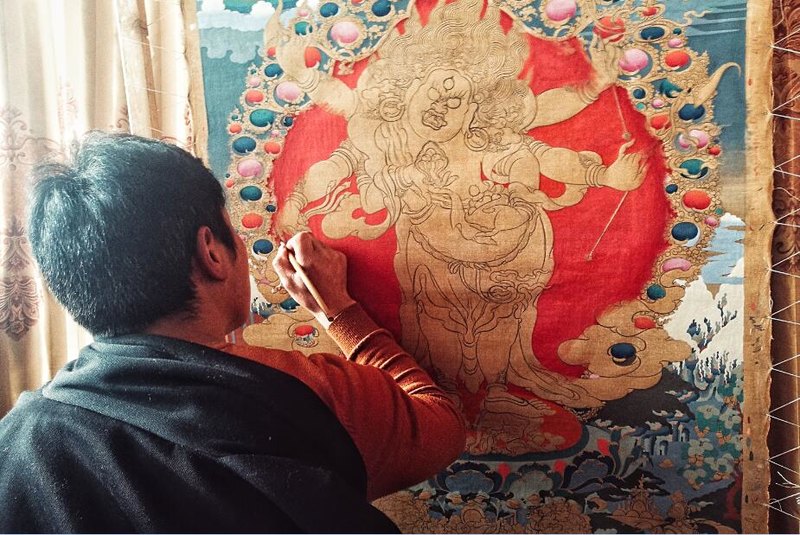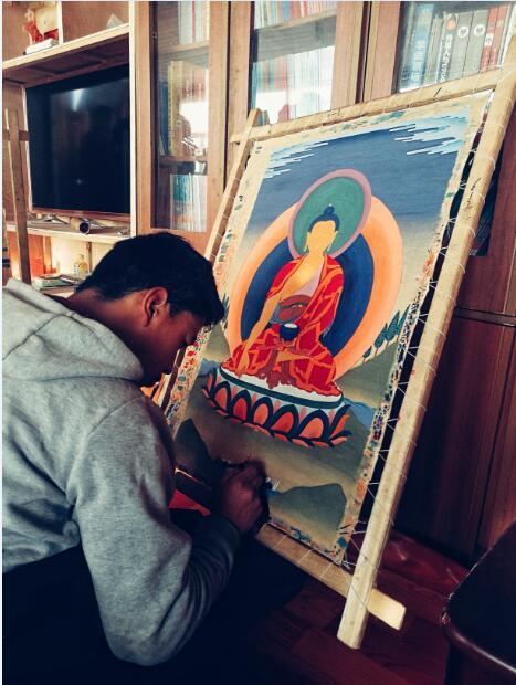 早起迎着初春的朝阳去到了阿坝县的特果唐卡艺术传习基地,阿坝县古.拉唐卡绘画起源于公元300多年前,由县洛尔达乡洛尔达村卓格寺(觉囊派)僧人古·班智达·秋央多吉创建,他通过学习“五明学科”工巧明,并结合师父口传心授技艺不断创新终成一派,而后一代代相传延续至今。