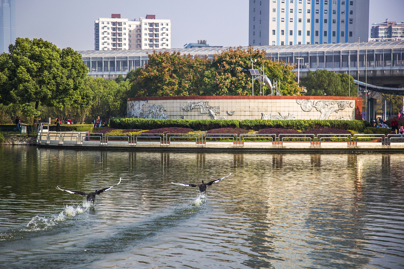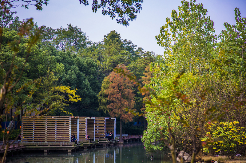好一派的山水秋景,湖边园内的九孔桥,亲水平台,游人们歇坐在此,天鹅,各式的水鸟们缓缓的从身边划过,呼吸着纯氧好空气,湖内的鸟儿们叽叽喳喳的叫着,人与自然的和谐而美好。
