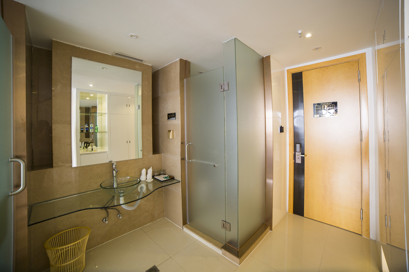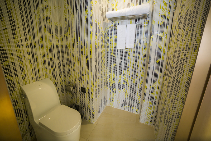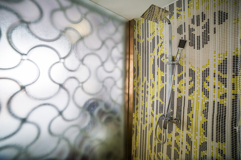 客房内的洗手间,纯透明玻璃的洗手台把卫生间和淋浴室隔开,分为左右两个分区。卫生间和淋浴室内都是以马赛克拼贴的元素,给人的情况大方的时尚轻快之感。