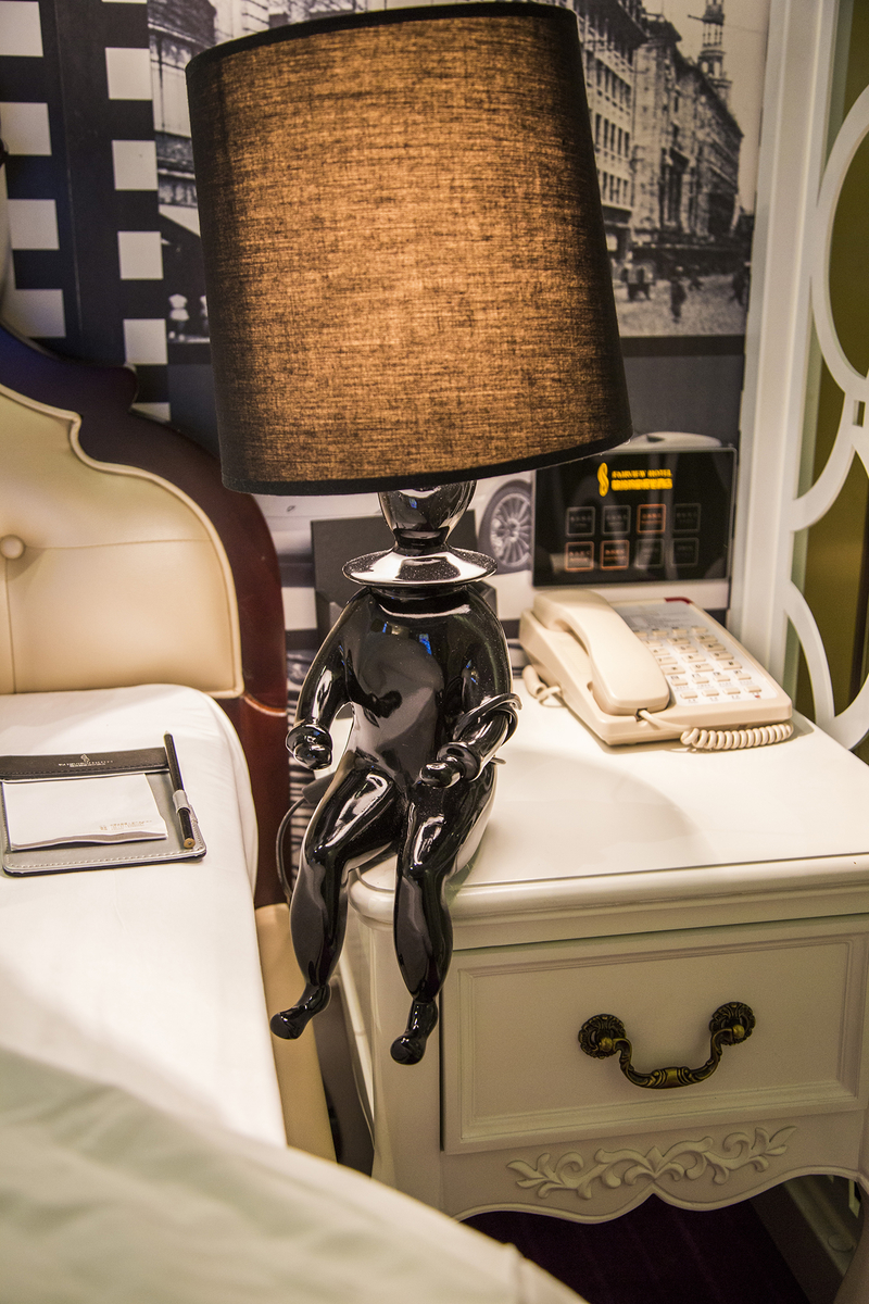 酒店的设计别出心裁,房间内的台灯也是极具特色的黑色造型娃娃,洁白的床品软软的好舒服,洗漱完毕,小女就上床去滚来滚去的好个开心。
