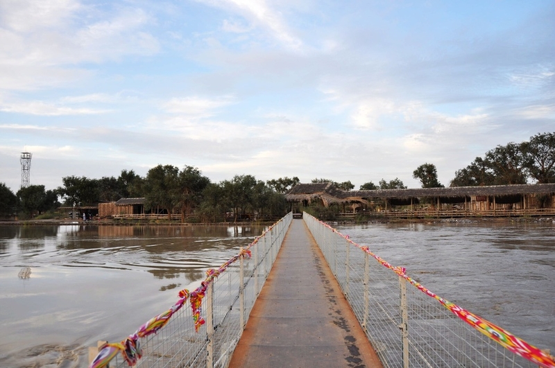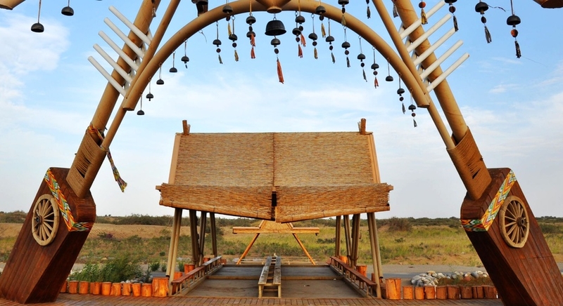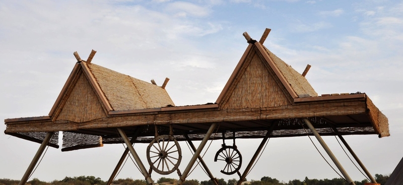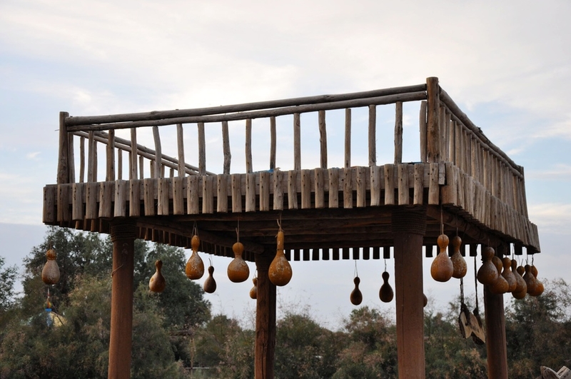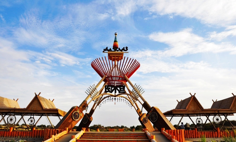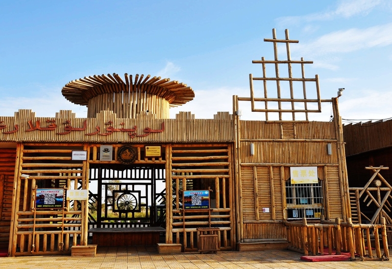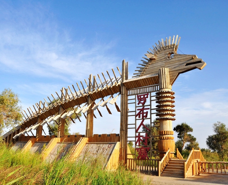 罗布人村寨正门形如一个戴着帽子的人的头部,两侧是鱼的图腾。在小小的罗布人村寨里游客可同时看到四样有趣的人和物,那就是罗布人、海子、胡杨和沙漠。罗布人在沙漠中的海子边打鱼狩猎,种庄稼,保持着原始的风俗习惯,其生活充满了神秘色彩。