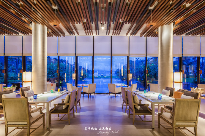 天色一黑,酒店的灯光就显得更加唯美,一明一暗之间别有一番滋味。夜幕降临,在酒店的沁园西餐厅,靠窗而坐,看着宝石蓝色的天空、听着海浪冲击沙滩的声音、吃着回味无穷的美食,生活就是如此美好!
