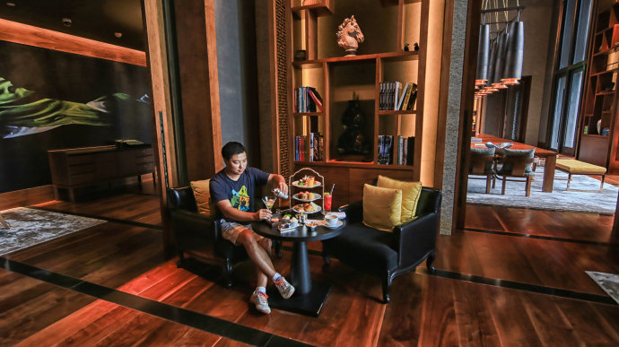 这里不仅适合发呆,更适合拍照。雍容华贵的装修,高挑敞亮的空间,独特好看的饮品,如果我不说,你一定不会知道,其实这里是柏悦酒店里的图书馆——悦海。