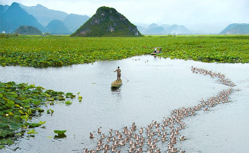 近看普者黑的水,清澈见底,水生植物的脉络清晰可见;远看普者黑的水宛若明镜。水鸟们在荷叶与湿地之间,自由而散漫的飞翔,几乎没有任何阻碍。水鸟无疑是最有动感的生命之诗,突地一下从水这头钻出来,划过长长的水波,给平静的湖面荡起了层层的涟漪。突地一下又从水里消失了,那情形真是美不胜收。站在船头,极目四望,峰回路转,山水相依相缠,荷叶荷花相拥相恋,身临其境,再浮躁的心也会顿时宁静。山连水、水绕山、有山必有洞、有洞必有水。溶洞群中,月亮洞、火把洞、仙人洞、神怡洞等格外多娇,灯光彩照,洞内石笋丛集,怪石挺立,晶莹透亮,色彩斑斓,瑰丽多姿,是大自然的神妙之笔,形成了“怪石、异水、奇穴”的地下天然景观。