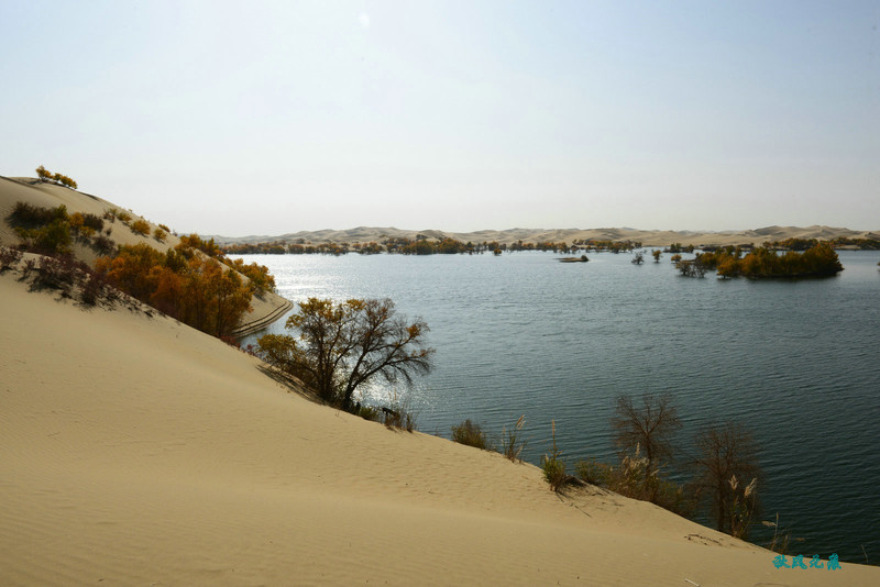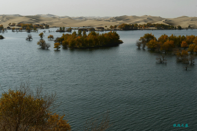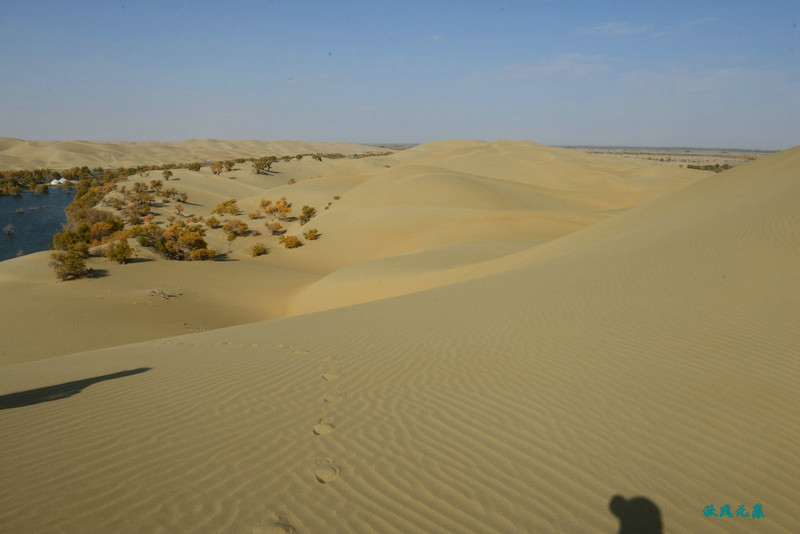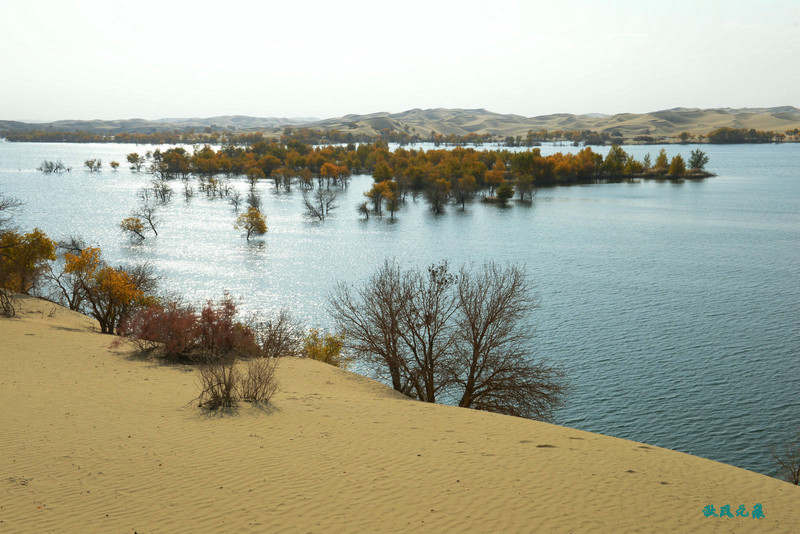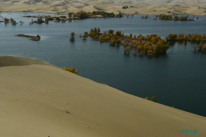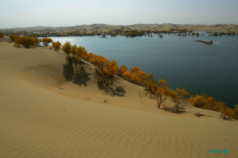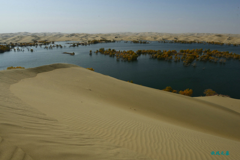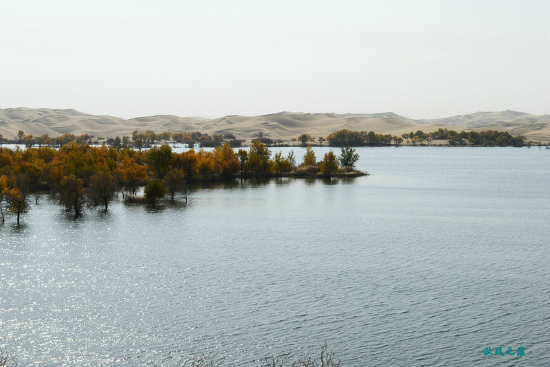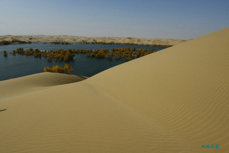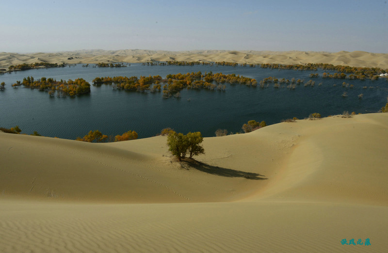 登上沙丘最高点,四顾葫芦岛,东边是茫茫沙丘,东边碧蓝水面与连绵沙丘相依,一簇簇胡杨在湖泊中央,这样的美丽让人醉心。
