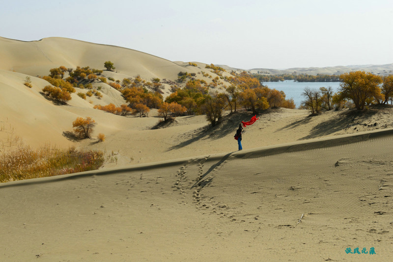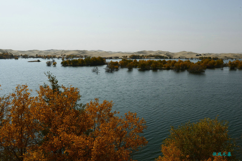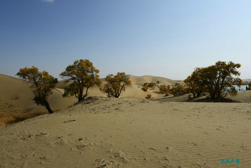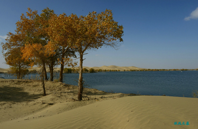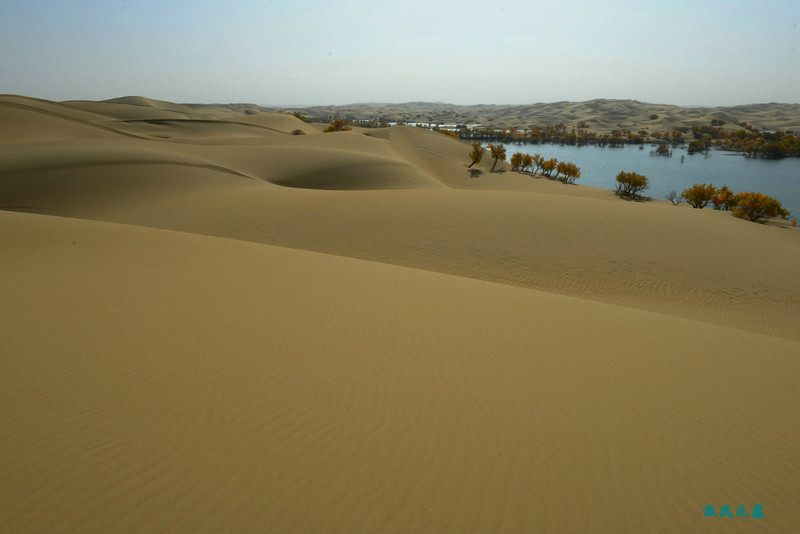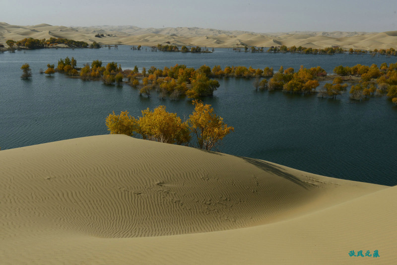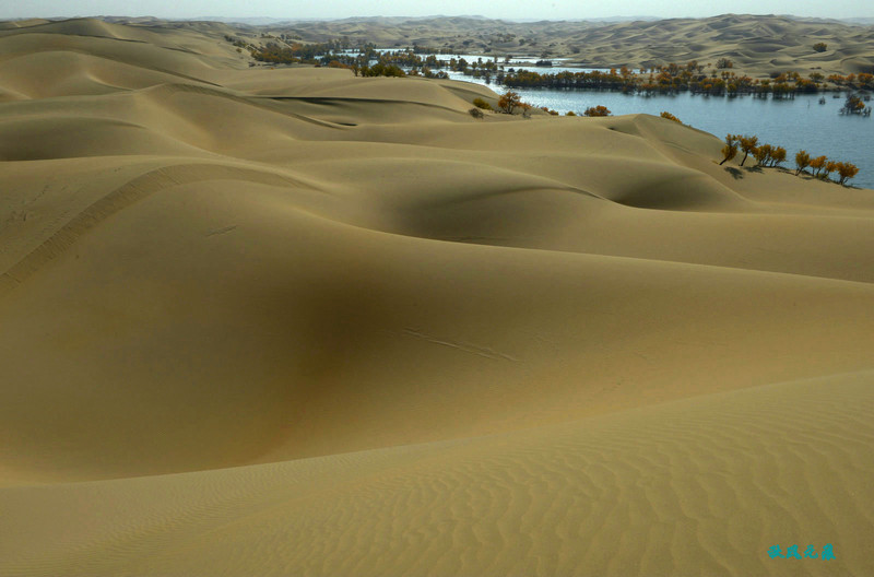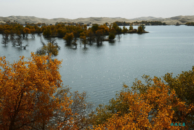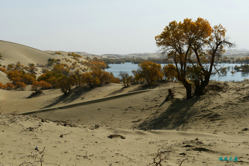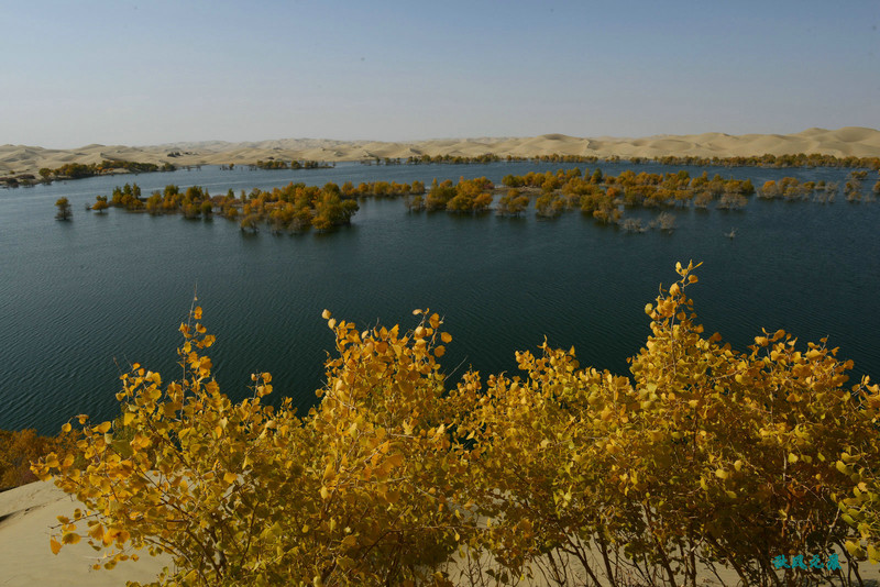 登上沙丘最高点,四顾葫芦岛,东边是茫茫沙丘,东边碧蓝水面与连绵沙丘相依,一簇簇胡杨在湖泊中央,这样的美丽让人醉心。