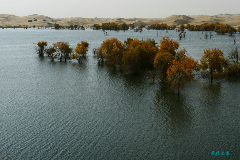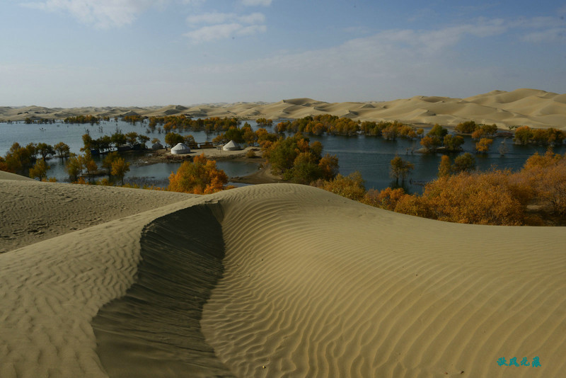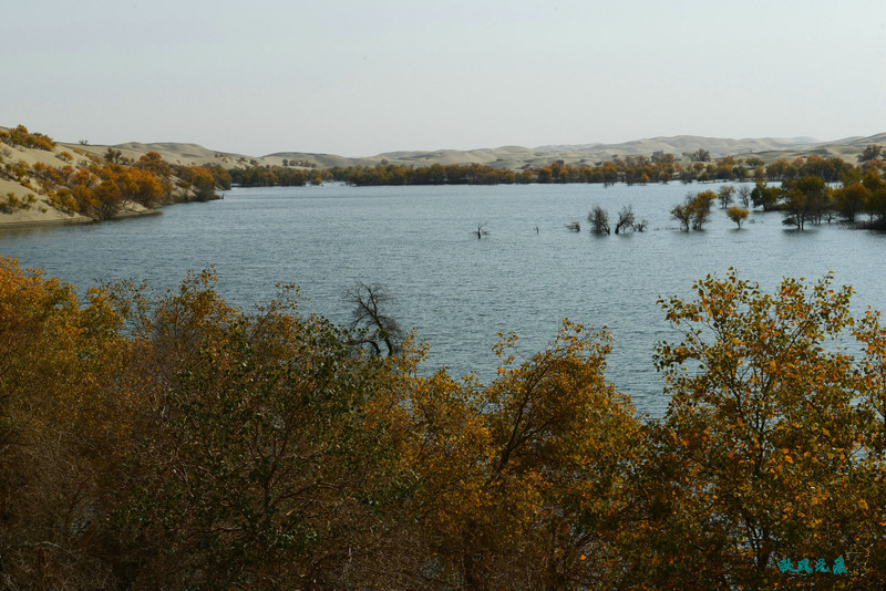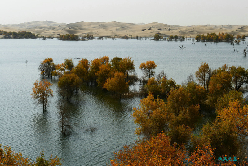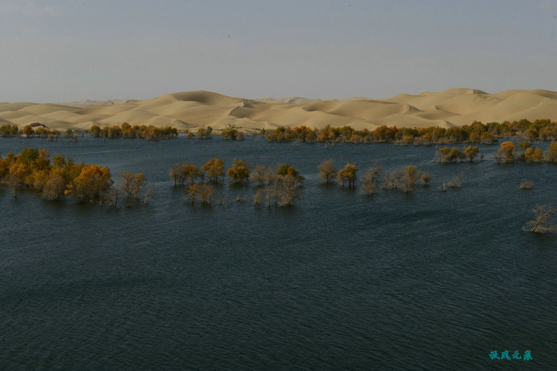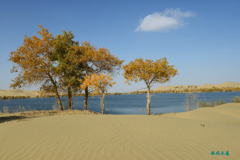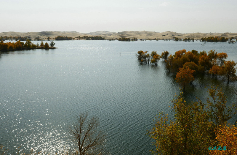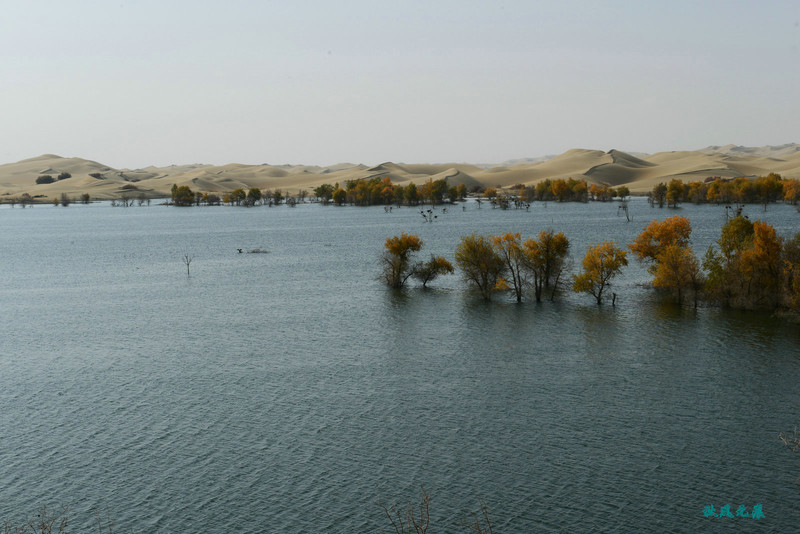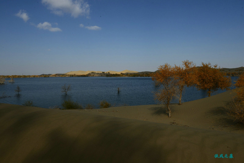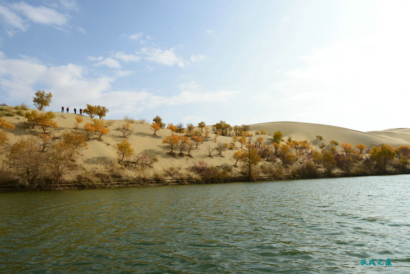 登上沙丘最高点,四顾葫芦岛,东边是茫茫沙丘,东边碧蓝水面与连绵沙丘相依,一簇簇胡杨在湖泊中央,这样的美丽让人醉心。