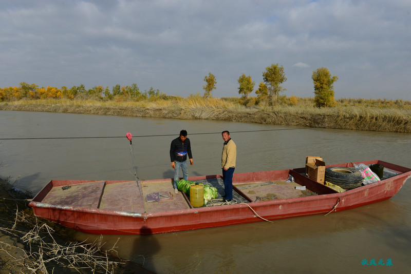 从乌鲁克镇出发,经过兵团的棉花田和戈壁造田改造段,来到塔里木河边,一条由缆绳拉动的渡船停靠岸边。在岛主何柱子和助手的摆渡下,我们来到塔里木河对岸,蓝天白云下,塔里木河边的胡杨金色灿烂,接引前去葫芦岛的卡车停靠胡杨林下,一幅探险景象,让人不由产生无数遐想。