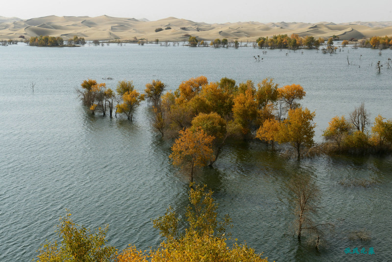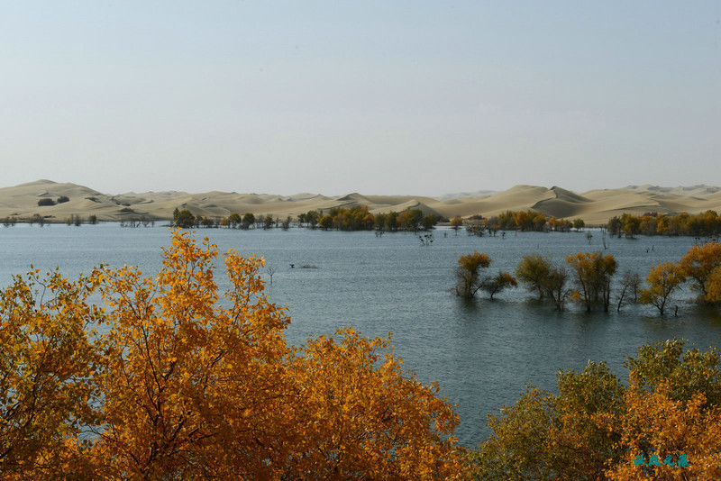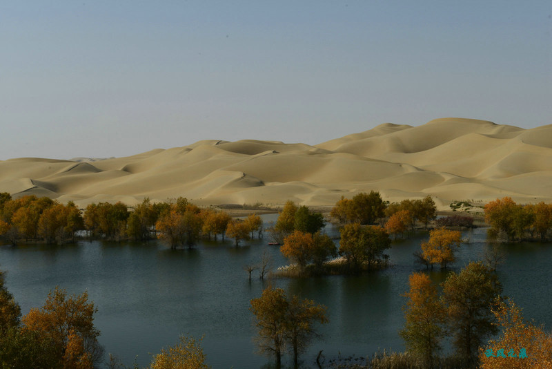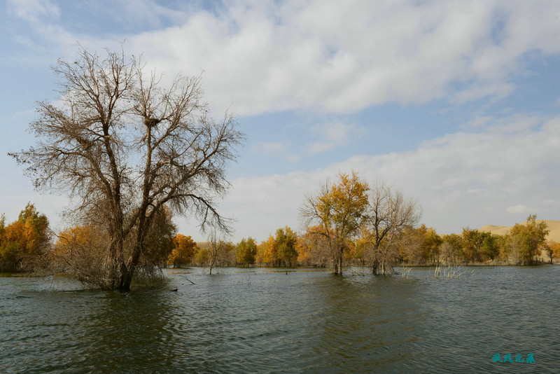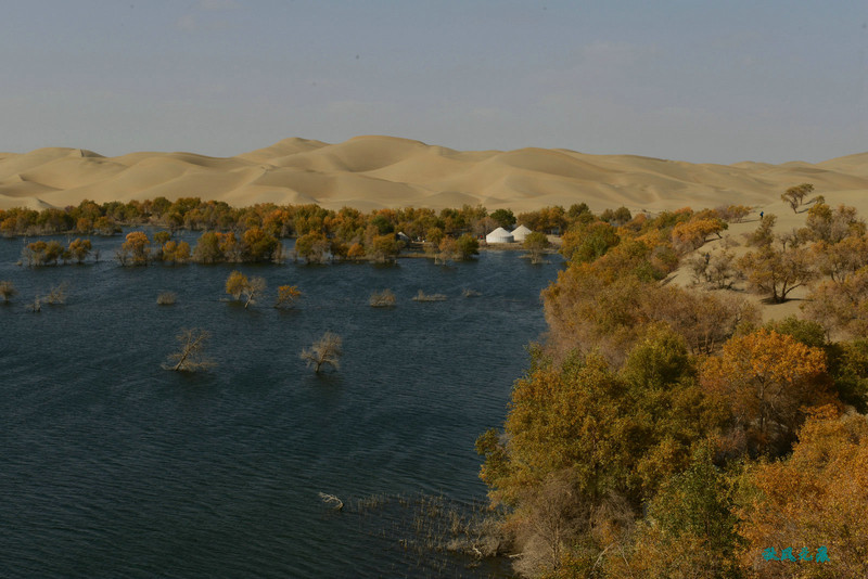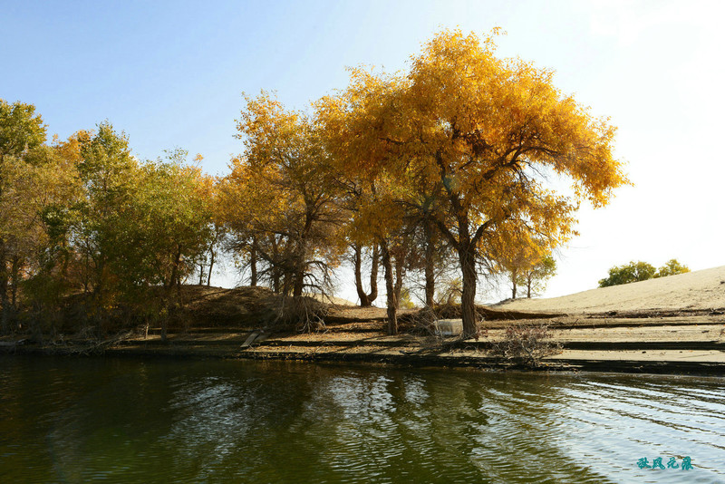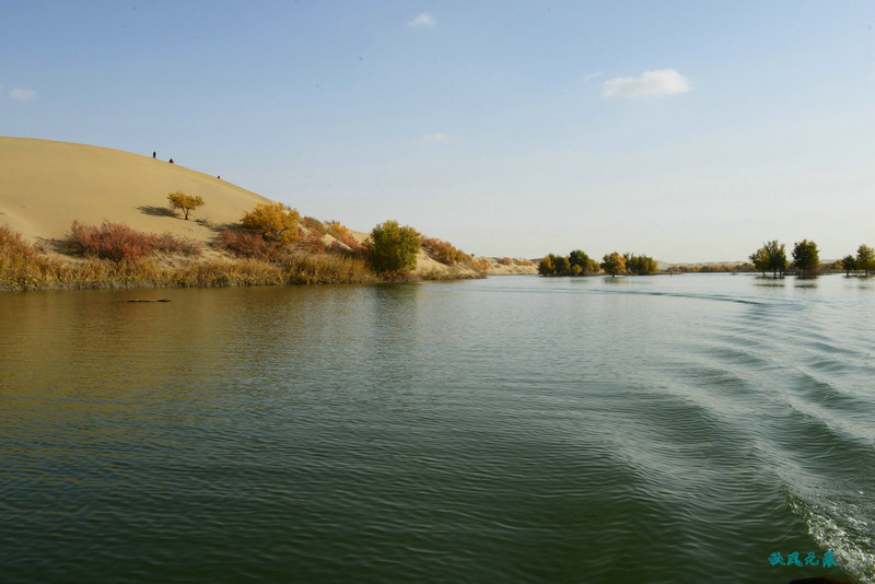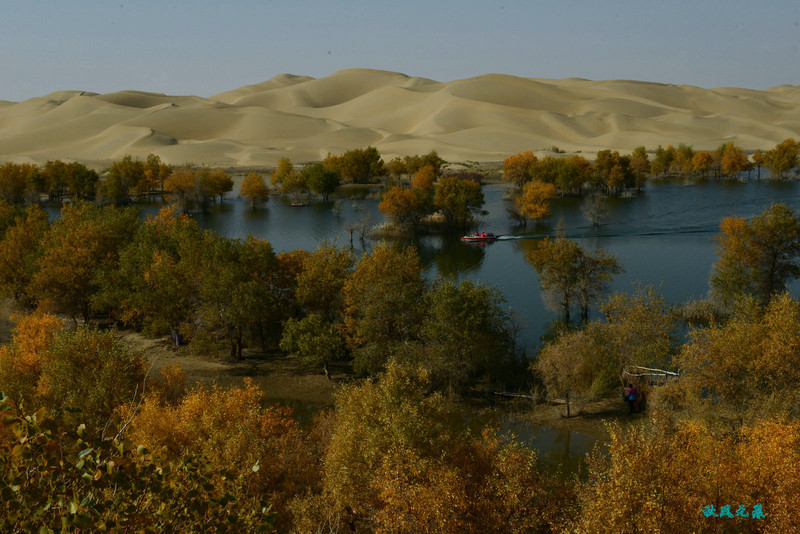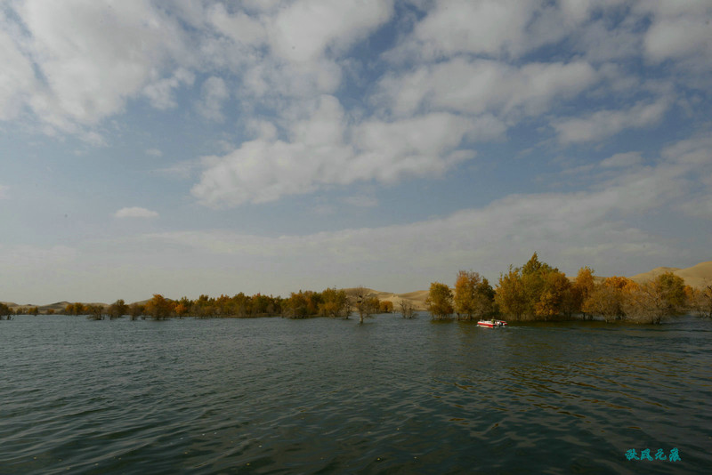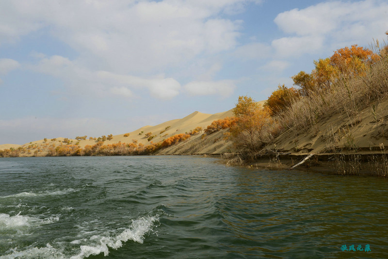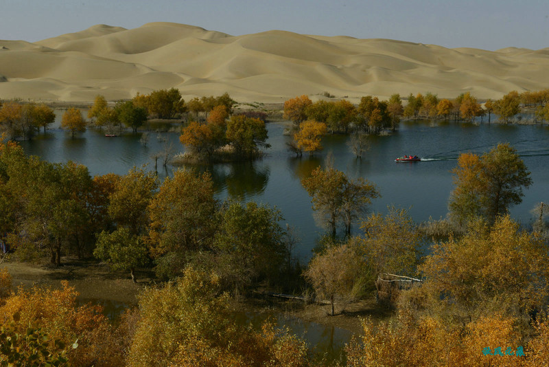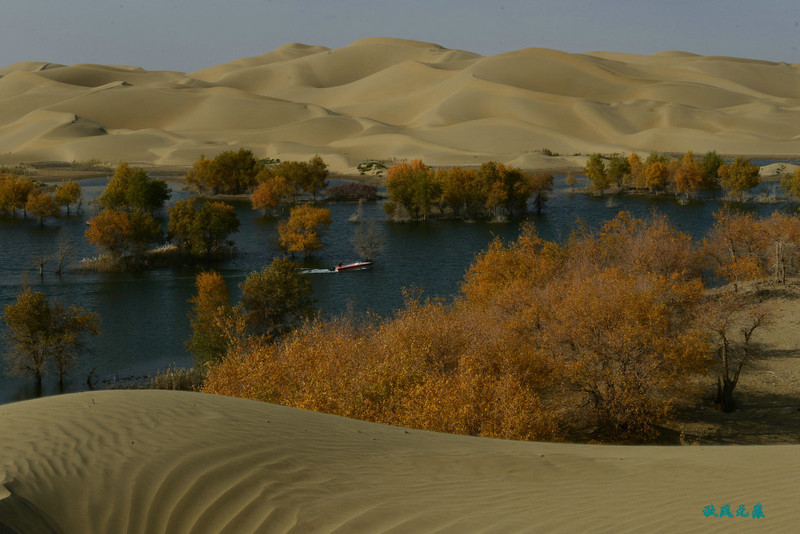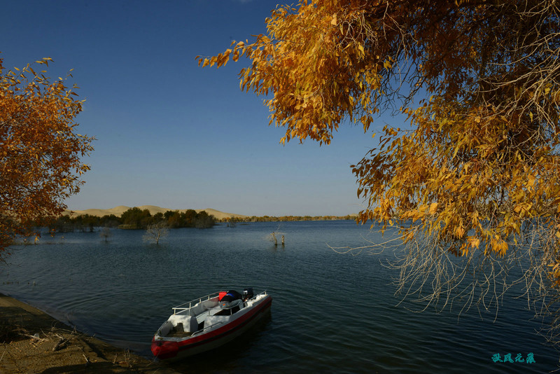 船划出浪花,沙丘胡杨染黄