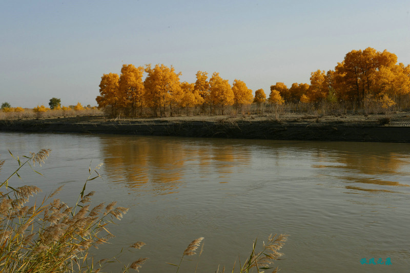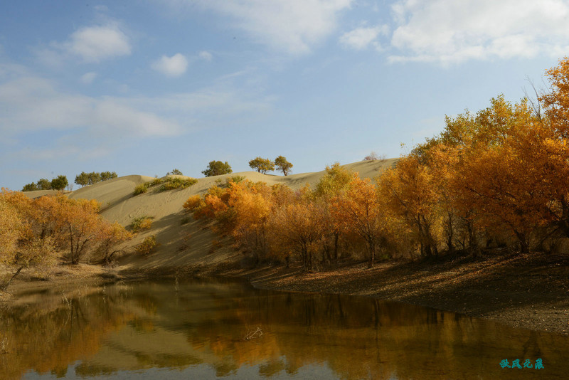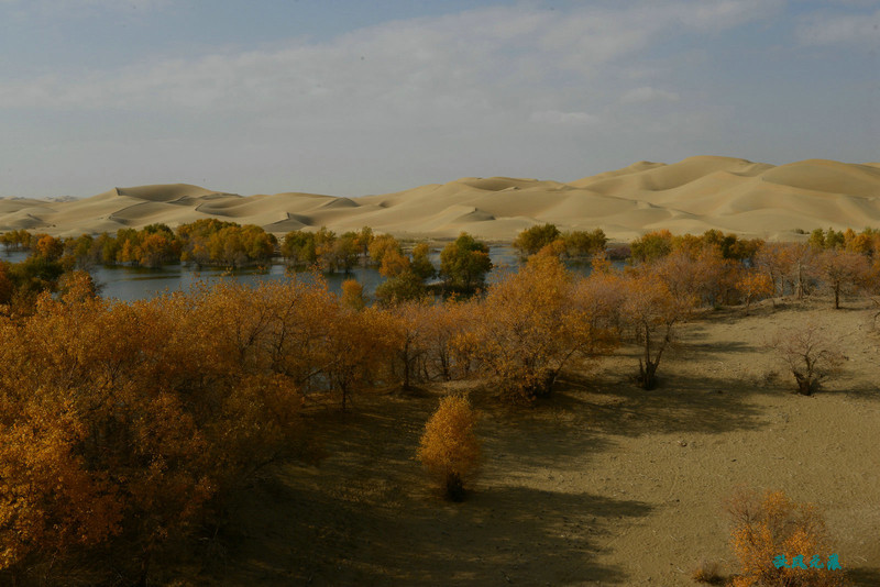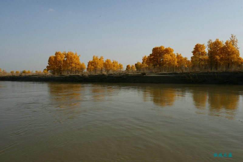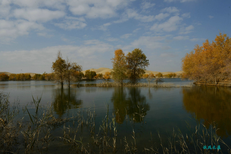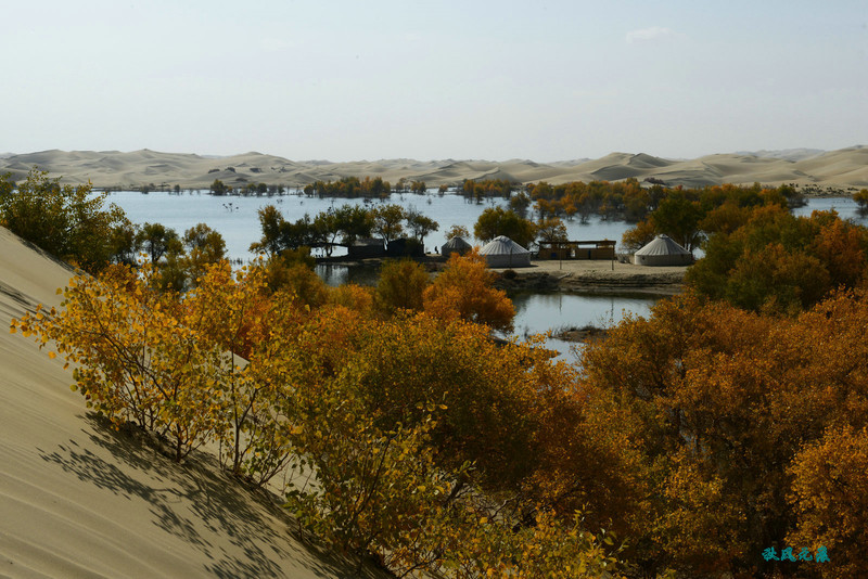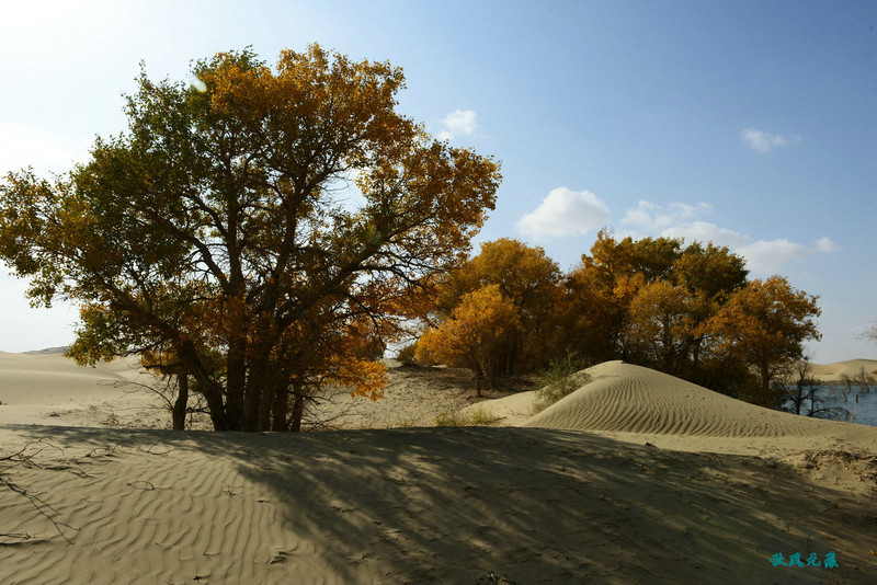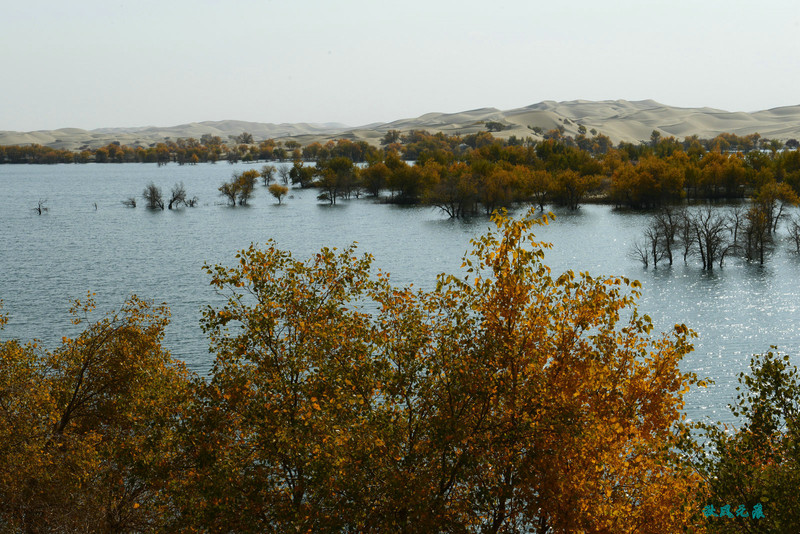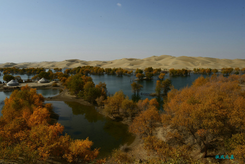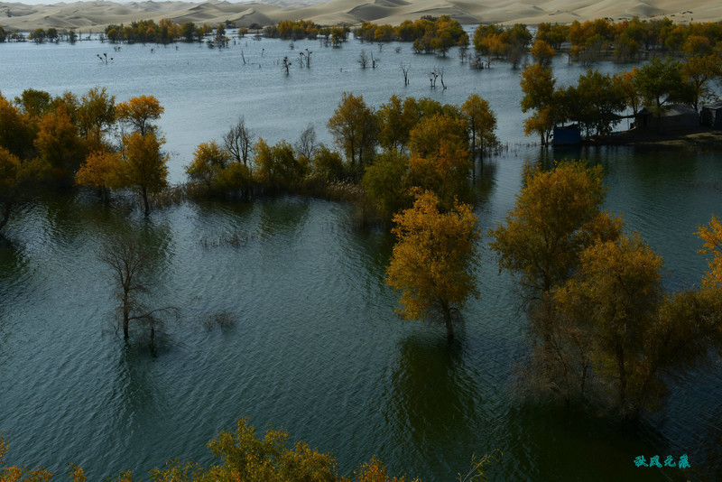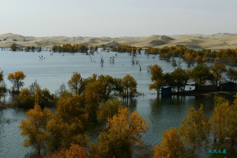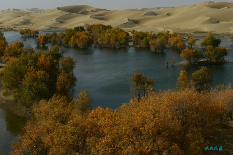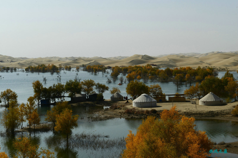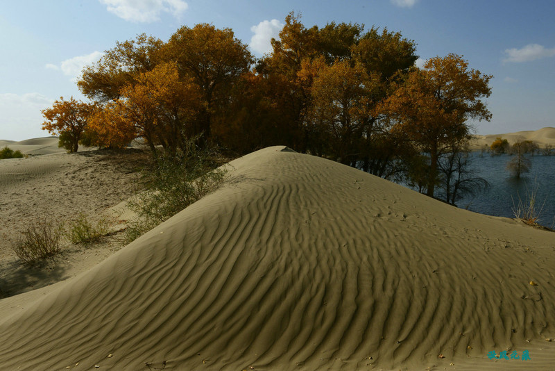 船划出浪花,沙丘胡杨染黄