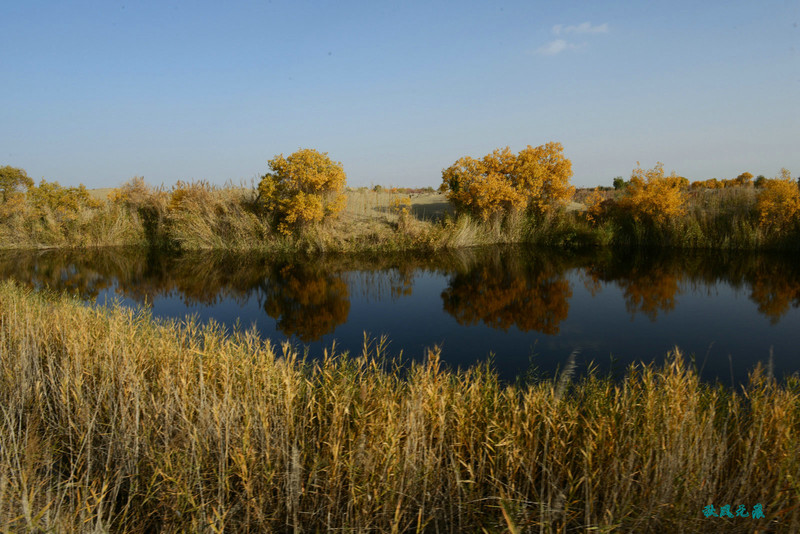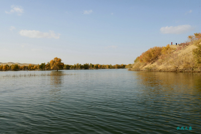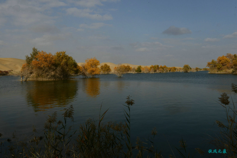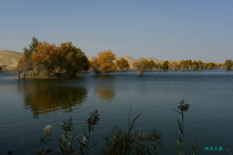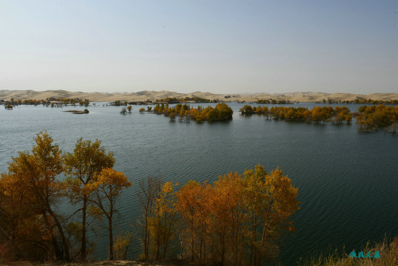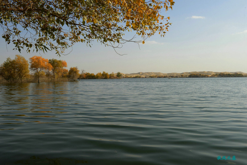 上岛回望,小船、秋叶,碧水,沙丘,一幅幅美丽画面不断闪现,斜阳里,塞外水景让人陶醉其间。