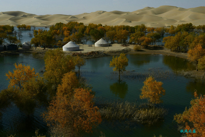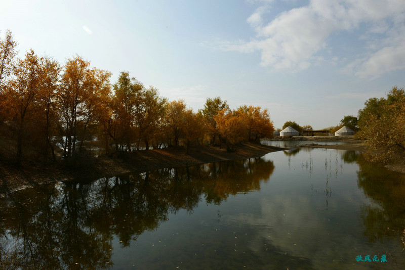 胡杨水影间,蒙古包点缀