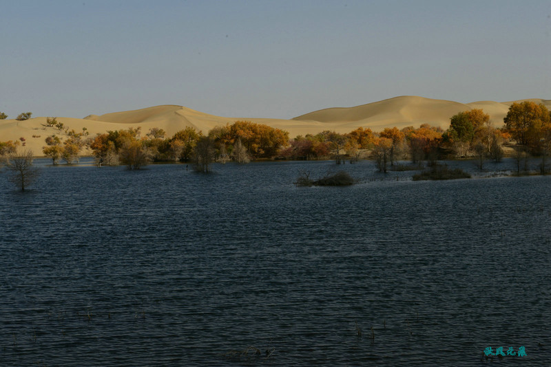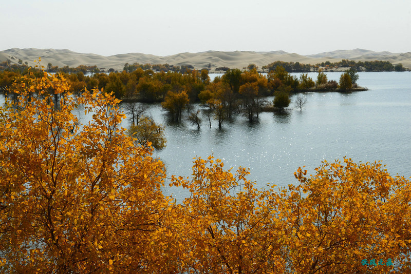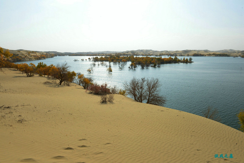 登上一个沙丘平台,葫芦岛的湖面渐渐呈现,碧蓝的水面依偎连绵沙丘,胡杨林在水面亭亭玉立,沙丘上点缀着金色的胡杨树,在逆光里远望,湖中树林成岛,心中惊叹,塞外居然有此绮丽景色。