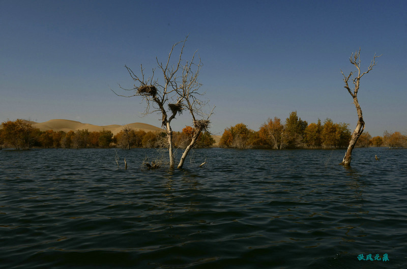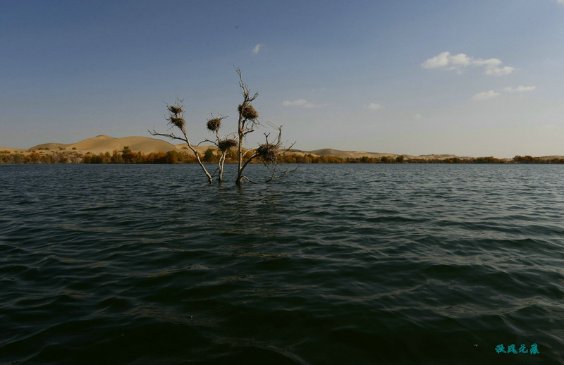 走下沙丘,在蒙古包用完午餐,乘坐小船前往另外一个沙丘,湖面上葫芦岛一个奇特景象鸟巢出现在一棵棵枯树枝上,来到岸边,一排排胡杨将美丽的迎接送上。