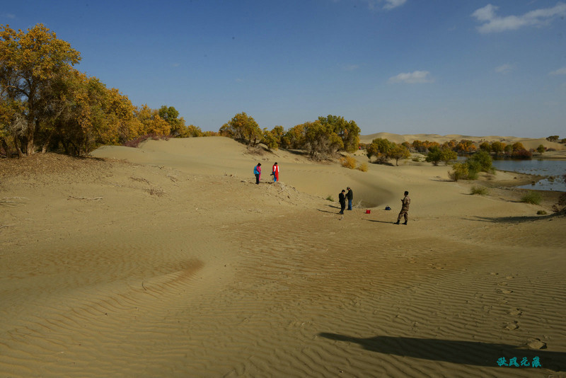 登上沙丘的路边,胡杨投影水泊