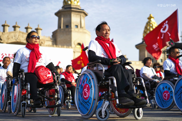 ▲参加50公里极限挑战的残疾人轮椅队伍,统一服装,身残志坚,意气风发,是长走队伍中一道靓丽的风景。