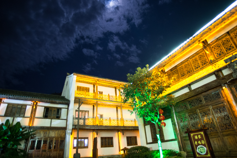 客栈外面的夜景也非常棒,在灯光的照射下,一片片竹叶的影子印在了墙上,安静美好。