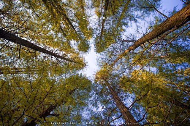 湖的面积很大,水质清澈,很平静,如镜子一般,把蓝天白云和美景牢牢的抓住在自己手里。湖中央有一个小岛,笔直的高大的杉树,也披上了秋天的色彩。