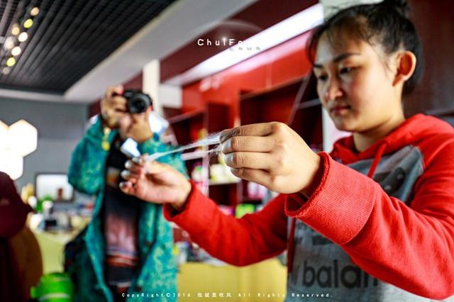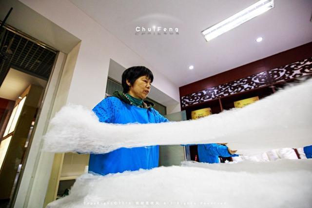 现场制作蚕丝被,摸了摸蚕丝做的被子,果然是很舒服