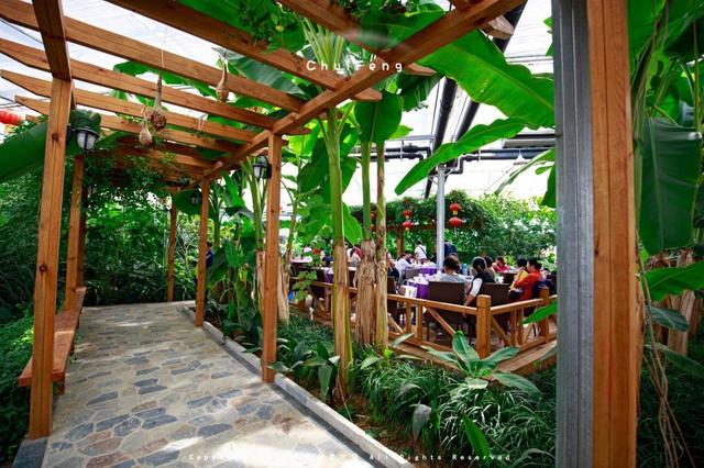 绿膳坊里面布满了五彩斑斓的热带植物和蔬菜瓜果。给食客带来了观赏性和趣味性。去吃饭的时候,还有一对新人在这里举办婚礼宴席。在这么有特色的餐厅举办宴席,相信也是一生难忘的婚礼。