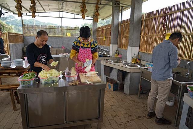 在老家菜园子这里可以自己摘菜,自己做菜吃。这里全部都是有机蔬菜,看看三个大男人手艺也不错吧。如果自带食材200一个灶台,如果景区备食材500一个灶台。