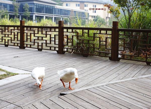 清晨从鸭子的嘎嘎声中醒来,打开窗帘窗外的景色让我一下清醒了,好美的天空,瞬间穿戴好衣服拿起相机来到了湖边,两只鸭子在木栈道上悠闲的散步寻食,湖水土楼客房的倒影鸭子游来游去,拖起长长的水波,我居然住在这青山绿水的美景中,幸福指数超强啊!