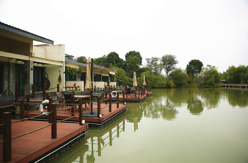 酒店的许多装饰,用的都是江南老宅子的门板,旧石磨用铁架子围住便成了一个茶几,整个庭院里都种满了花草,水池里有含苞欲放的睡莲,水面清可见底,成群的鱼儿在水中嬉戏。