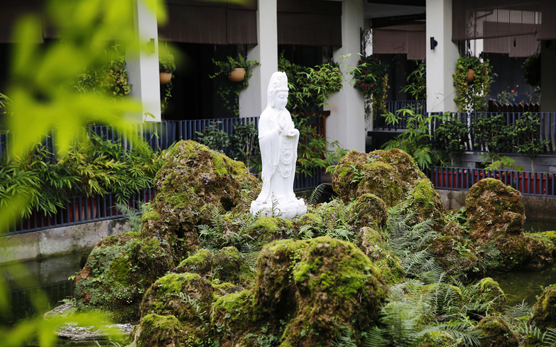 主人对于每处细节都处理的一丝不苟,在庭院的中心位置,有一处人造的假山,其完整呈现了普陀山的整体地貌,上面那尊观世音佛像是用缅甸白玉雕刻而成,重达380斤,可谓整个酒店的“镇宅之宝”。