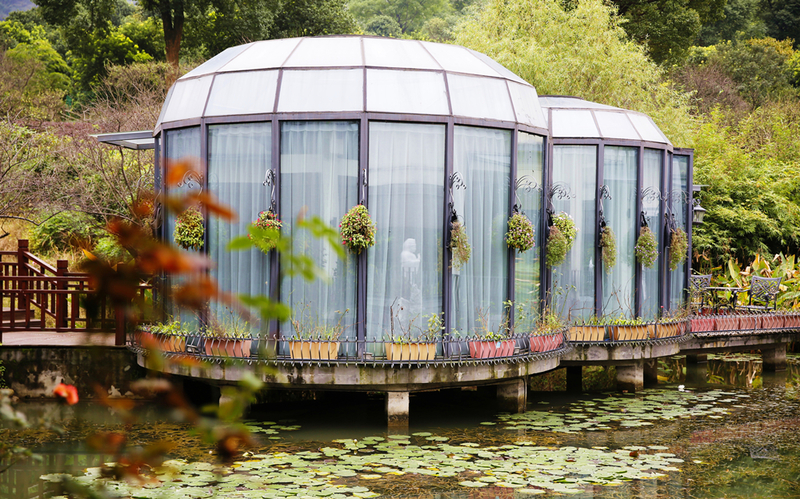 在一期的16间客房设计上,他们也是煞费苦心,将其打造出了多种不同风格。最夺人眼球的“观月”是一间水上玻璃房,设计灵感来自马尔代夫的水屋,四面都是透明玻璃,晚上灯光亮起,如梦似幻,虚实难辨。