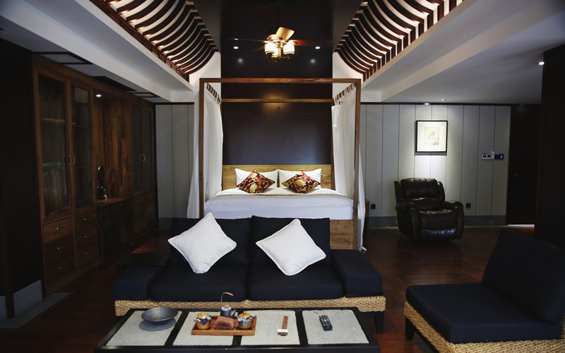 “圆月”是酒店内唯一的婚房,用的是仿古明清式样的家具,配上纱幔,整体红色的主调,相当喜庆。推门出去,外面还有片很宽敞的露台,远处的风景尽收眼底。