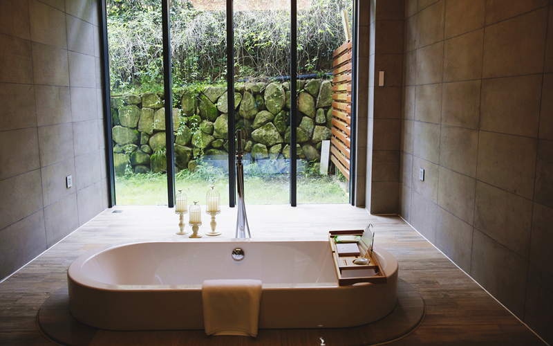 有些房间窗外便是美丽的湖景,有些房间自带小庭院,有些房间露台上带有小型SPA池,而欧式风格的房间浴缸是嵌入式的,十分唯美,浪漫。