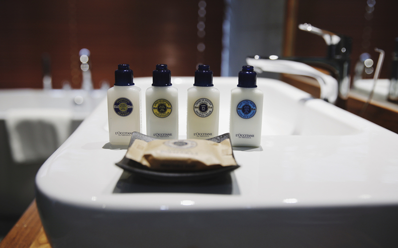 客房的洗漱用品一律都是欧舒丹乳木果系列,香皂,沐浴露,洗发水,护发素和润肤乳一样不少,为了让客人放心泡澡,还提供了一次性的泡澡袋。