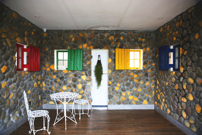 为了打造摄影主题,在二层房间的公共区域,主人索性将其布置成婚纱和写真的拍摄点,五彩的窗户,鹅软石的墙面,欧式的座椅,一切都显得恰到好处。