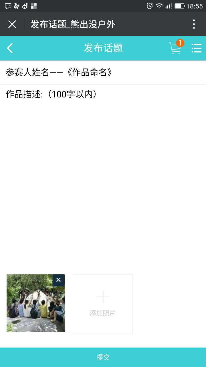 步骤三:标题备注参赛人真实姓名和作品名称,在内容里写上作品描述(100字以内)。然后就可以在下面添加你的图片啦。参赛作品每人只限上传一张