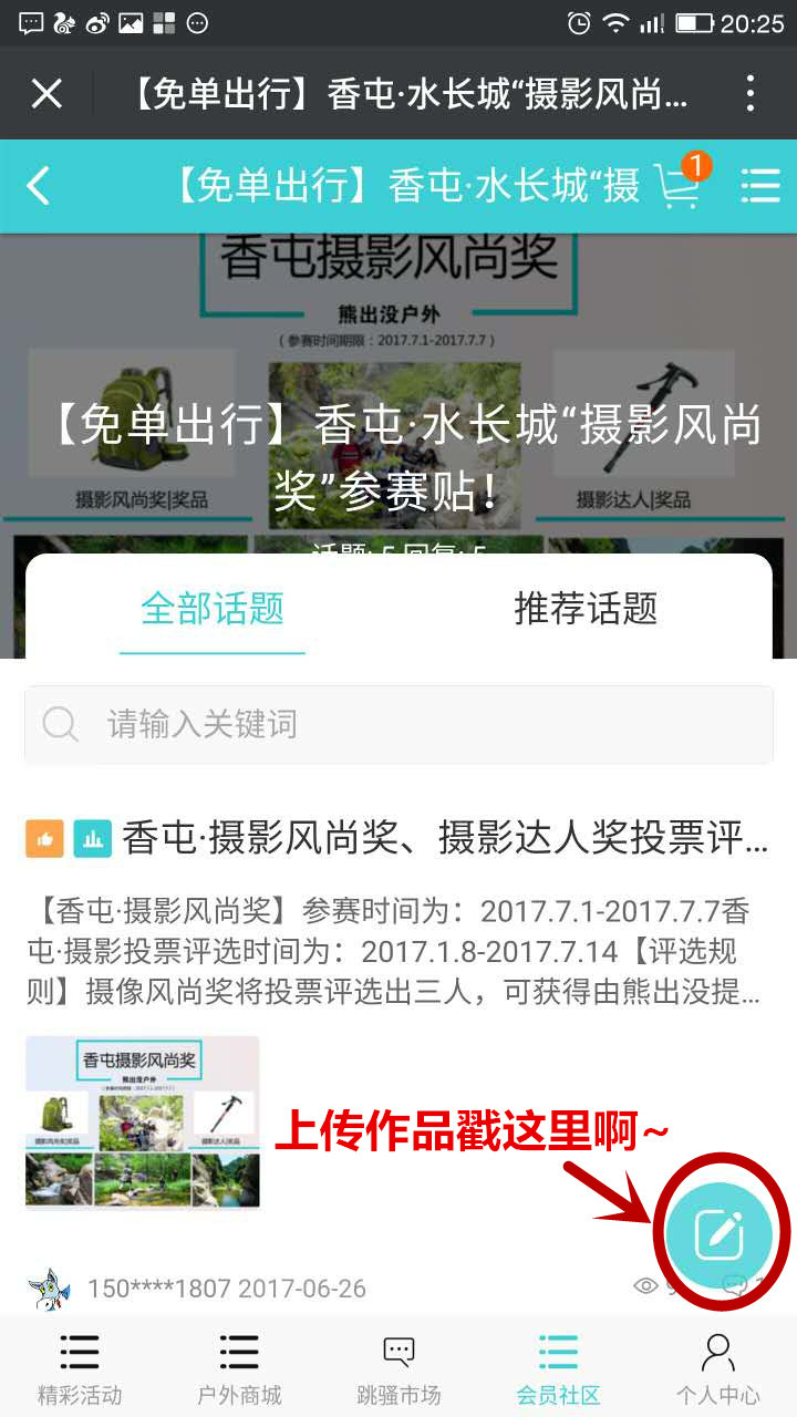 步骤一:打开“熊户外V”服务号 → 会员专区 → 点击互动话题进入“香屯·摄影风尚奖参赛帖”