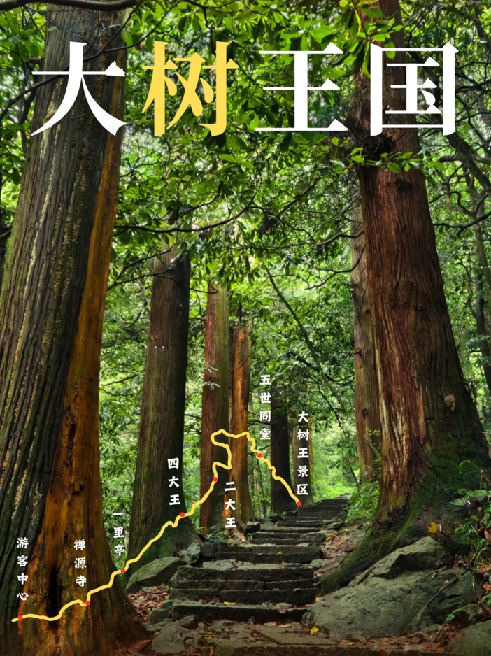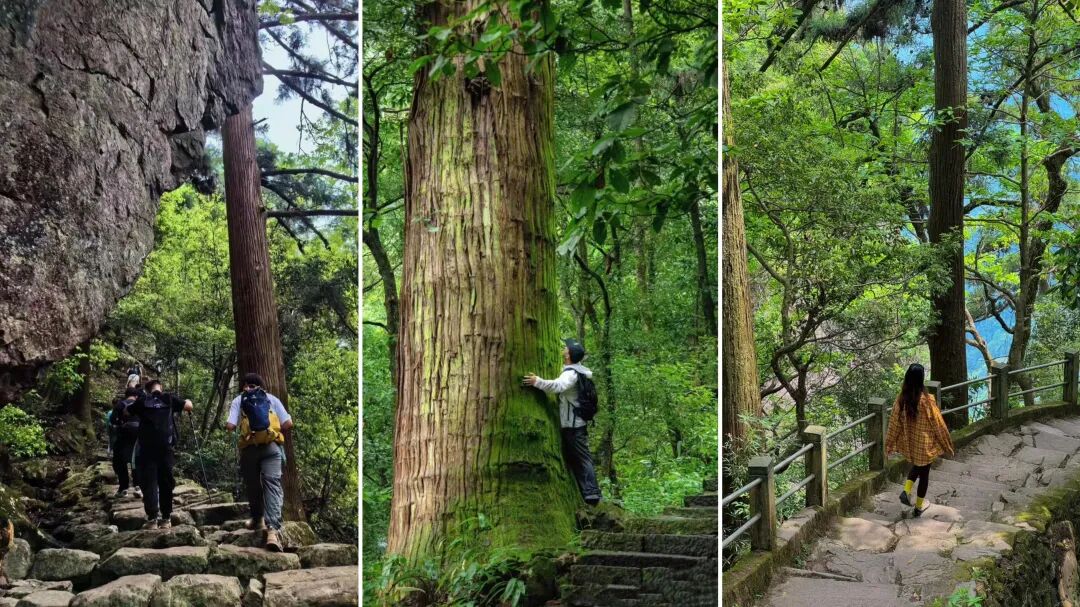 - 跟着领队我们先来到【源禅寺】,逛一逛这座山里的古寺。随后开始大树王景区徒步,原始森林既视感迎面扑来,整个眼界峰峦叠翠,古木葱茏,更附加奇岩怪石之险,有流泉飞瀑之胜,一副生态旅游胜地景象。远眺山峦,石多形奇,争相媲美,时不时还能听到流水声!大树王景区内大树参天,可以找到几人合抱的柳杉、直冲云霄的金钱松与五世同堂的古银杏,是名副其实的大树王国。随处可见参天巨树—柳杉树,浓郁的绿色,就像闯入了迷雾森林。在这里必做的事情就是抱树~一路爬,一路拍照~