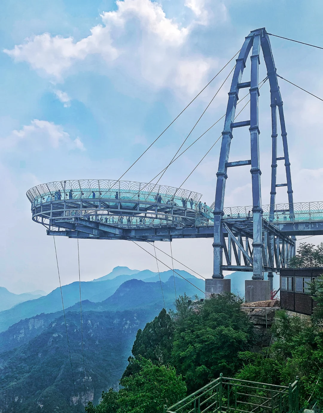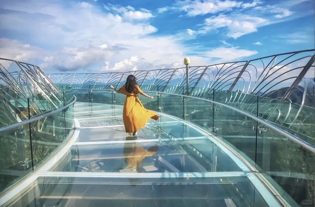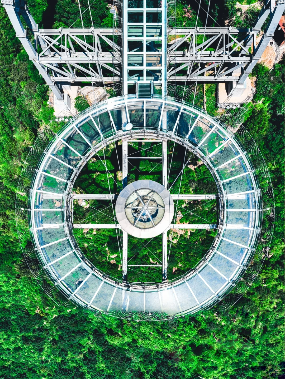 该观景台最大悬挑长度32.8米。较美国科罗拉多大峡谷悬空玻璃桥还要长11.4米;比被称为“世界第一悬挑玻璃桥廊”的云阳龙缸景区悬挑还长6.12米。悬空钛合金玻璃“UFO”观景台,设计原理采用了独特的设计原理—钛合金、合金钢、拉索和防弹玻璃相结合。