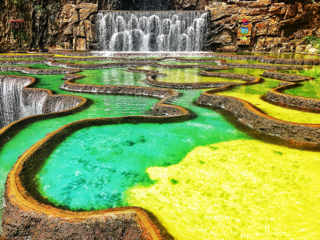 七彩池瑶池是由大大小小的水池组成,所有的池水来自同一条瀑布,水流到各个水池里,颜色却不同了。池边由金黄色的石粉凝结而成,像一圈圈彩带,把大大小小的水地围成各种不同的形状,有像葫芦的,有镰刀的,有像月牙的,有像盘子的,有像莲花的……