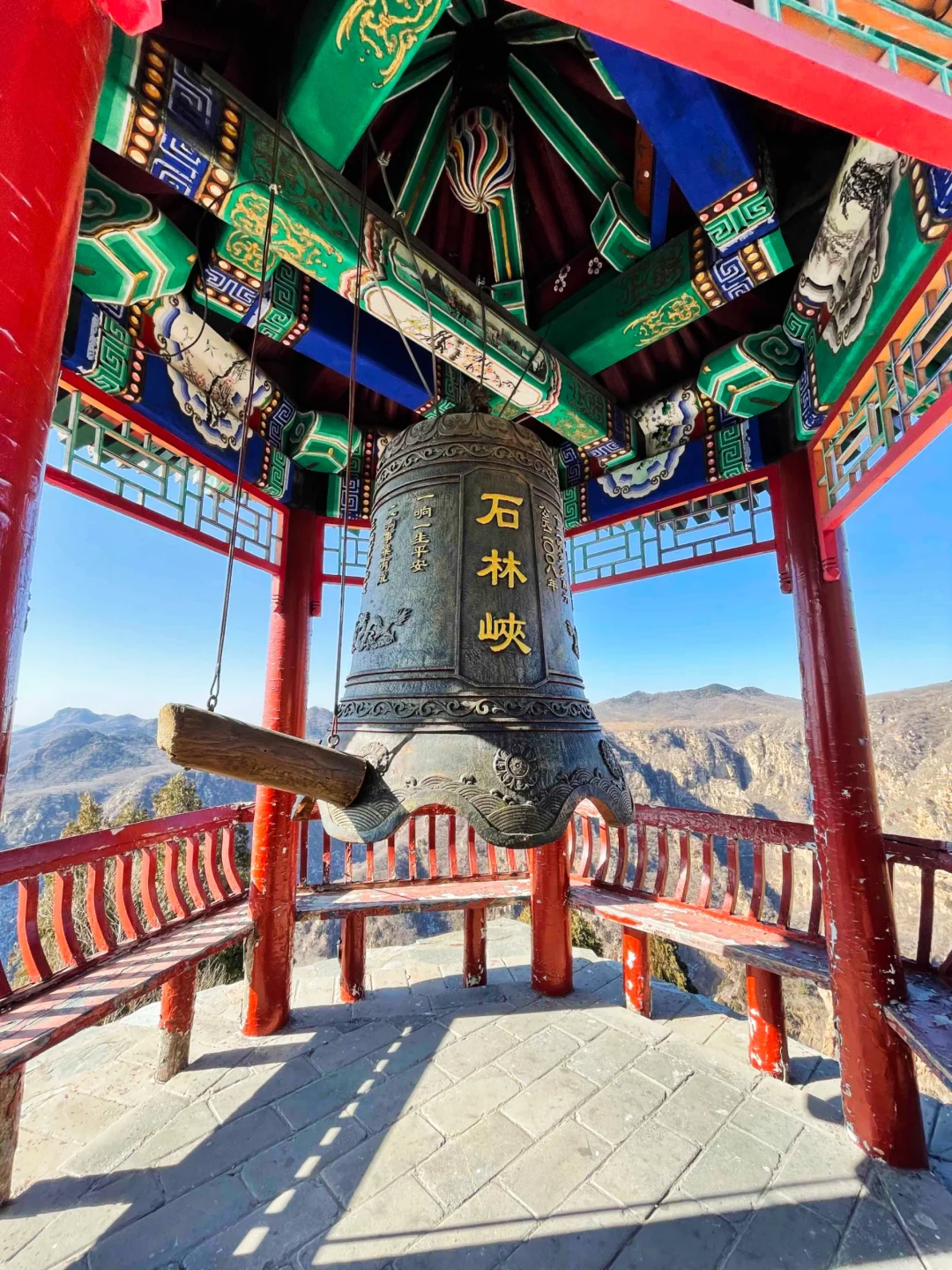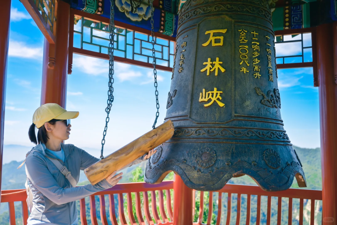 祈福点钟亭 下了龙王山索道,在接近山顶的位置,有一座古香古色的单檐六角亭,亭里悬挂一口大铁钟,直径一米一,通高一米六。钟上镌刻着吉祥铭文,游客可以在此撞钟祈福。
