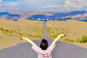 网红公路景色真的超美,无尽的沙海,望不到边,景区和城市遥相呼应,走在景区内,放眼望去就能看到高楼大厦,仿佛在沙漠看到了海市蜃楼!一个个沙丘此起彼伏,在太阳的照射下闪耀着金色的光芒!
