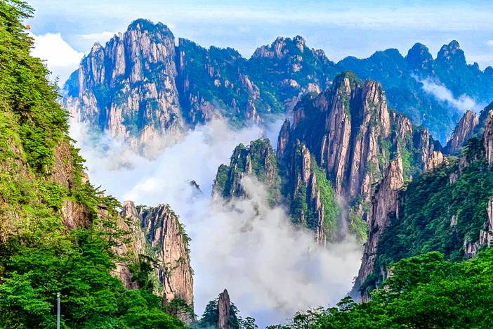 黄山,位于安徽省南部的黄山市境内。黄山风景区东邻浙江,南连江西,北与宣城、池州两市接壤,是长江与钱塘江两大水系的分水岭,也是安徽省最著名的的旅游风景区。奇松、怪石、云海、温泉、冬雪是黄山最为人津津乐道的“五绝”。