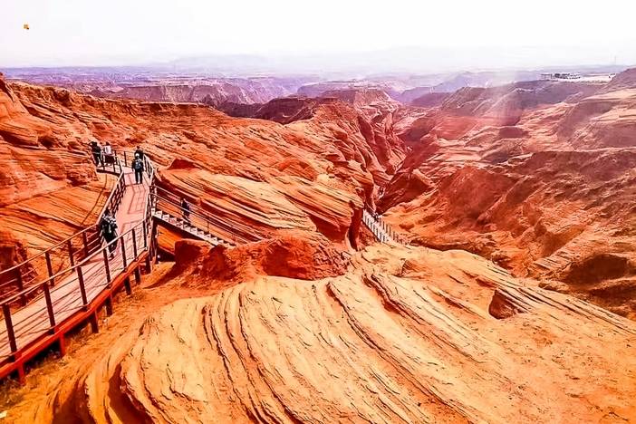 早餐后集合出发前往【靖边龙州波浪谷】,龙州丹霞地貌可与美国西部波浪谷相媲美,是一处摄影、探险、旅游的绝佳圣地。红色砂岩在风雨剥蚀下形态各异,一线天、波浪谷、水上丹霞景区让你惊叹于大自然的鬼斧神工。景区出口有各种具有陕西特色的小吃,如凉皮、凉面,味道都不错,大家自行探索品尝吧!