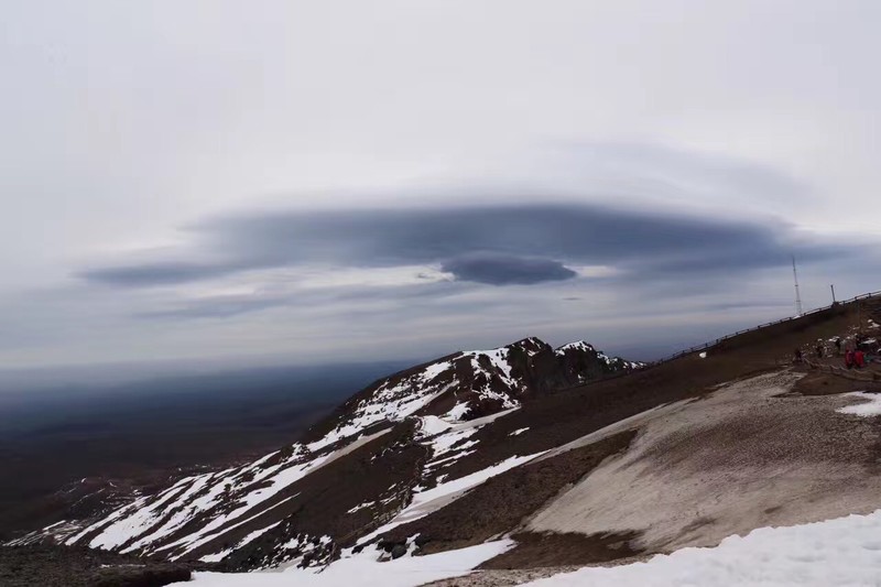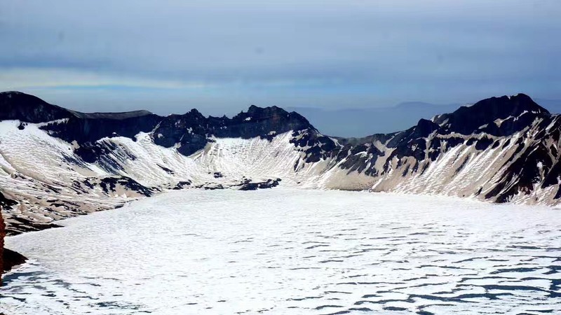 到达山顶后,就排队上主峰看天池。因为我们去的时候天比较冷,并且前两天刚下过大雪,所以天池还没化呢。但是!山上是真的冷啊!实在扛不住的朋友还是在下面租个羽绒服吧。是真的冷。
